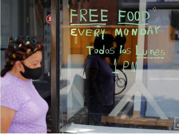FILE PHOTO: A pedestrian passes a notice for the Revival International Center (Centro Internacional de Avivamiento) food pantry, in a city hard hit by the coronavirus disease (COVID-19) outbreak, in Chelsea, Massachusetts, U.S., July 9, 2020. REUTERS/Brian Snyder