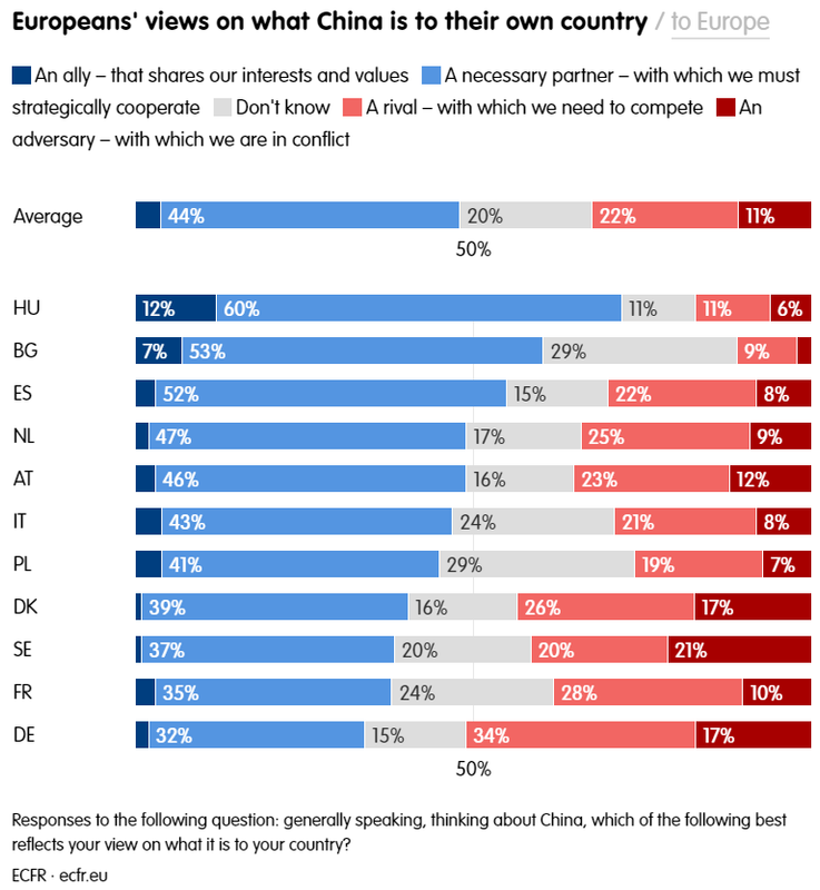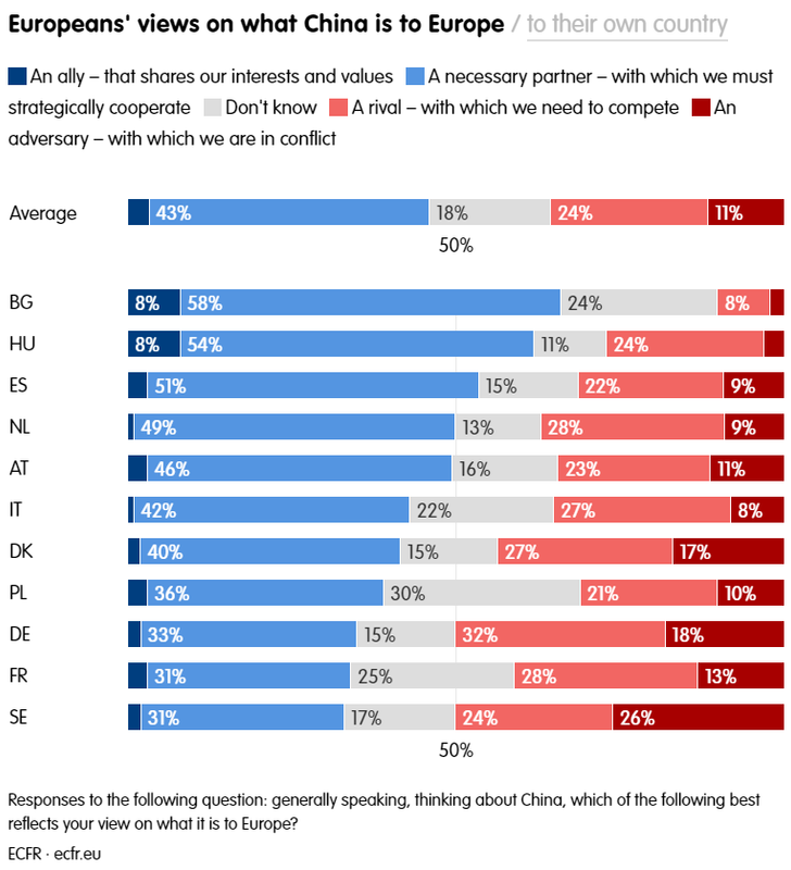 In April 2023, ECFR conducted an opinion poll across 11[/27] EU member states - Austria, Bulgaria, Denmark, France, Germany, Hungary, Italy, the Netherlands, Poland, Spain, and Sweden - to understand how European citizens see their place in the world today. The results of the poll show that their cooperative foreign policy instincts are adapting slowly to the new geopolitical reality that is characterised by growing polarisation. [...] [EC Pres. Ursula] Von der Leyen dispensed with the EU's established triad [?] to describe China as a "partner, competitor, and [PERVASIVE] rival" and emphasised the need for active, [DELIBERATE], multidimensional risk minimisation in Europe's dealings with Beijing. With this strategy [sic] of "de-risking", she pushed for a new consensus in Europe on the importance of revisiting its relationship with China. [...] The findings of ECFR's latest poll show that, in many ways, European citizens are more on Team Macron than Team von der Leyen. [...]