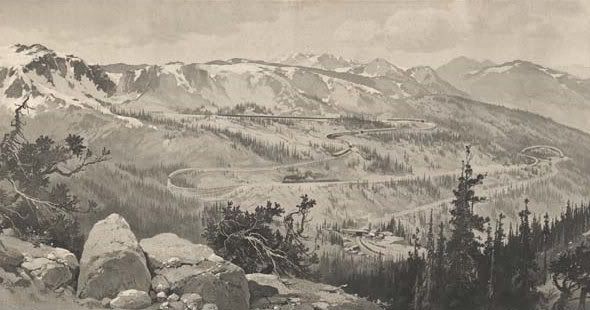 What would have become the North American railroad reaching the highest altitude4 was the Argentine Central, west of Denver. Begun 100 years ago, it climbed up a steep mountainside with 7 switchbacks (first 2 above connecting railroad's double loop), but then construction ended half-way due to WWI. Tracks ended abruptly just below a nondescript bulge on a ridge – the 13,117 feet (3,998 m) Argentine Peak5 (photo from Denver Public Library; also compare with the postcard version to see how it was tampered with):