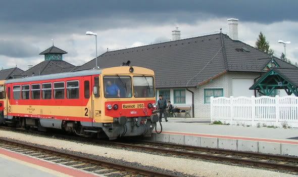 MÁV [series] Bzmot [no.] 293 railcar at Zalalövő station (along the rebuilt line to Slovenia), with standard MÁV fence (photo from RailFanEurope.net by Helmut Uttenthaler)