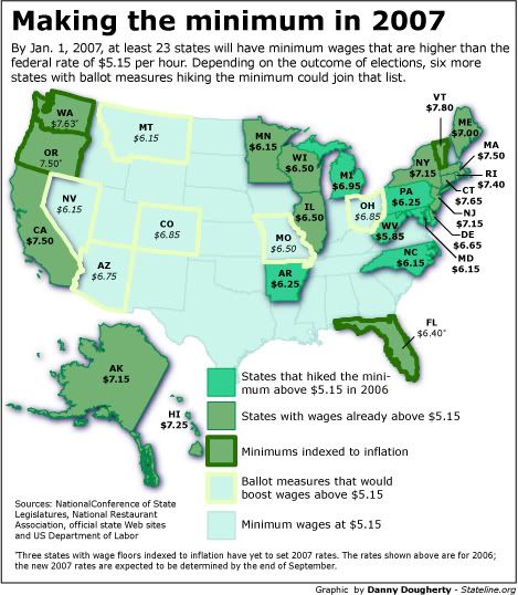 Last month The Economist published a story on the minimum wage in the UK, which, on October 1st, reached £5.35 per hour, or, at the time, $10.08. (The dollar figure has probably risen since then, given sterling's small gains since the Bank raised rates to 5% last week, as well as the fact that the UK is now nearly doubling America on GDP growth, but I haven't checked the exchange rates in a few days.) As an American, this is, of course, a stunning figure to me, even more so given Britain's moderate, albeit rising, unemployment rate.