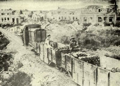 A Canadian-built field railway with gasoline-engine locomotive transports munition to the front at Verdun. From the FIRST WORLD WAR.com photo album