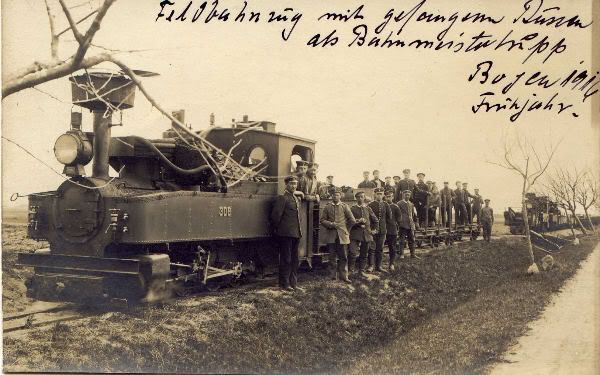 But, once, there was an entire class of railways different from that: rumbling little trains running on makeshift tracks never intended to last long, and easily re-laid somewhere else. The heyday of these railways was in the second darkest hour of Enlightened Europe's history: World War I.