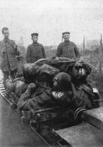 Arras/Vimy, spring 1917 (same battlefield as on next picture): a German field railway is loaded for its way back with its ghastly cargo. From the Images of the Dead at Stahlgewitter.de