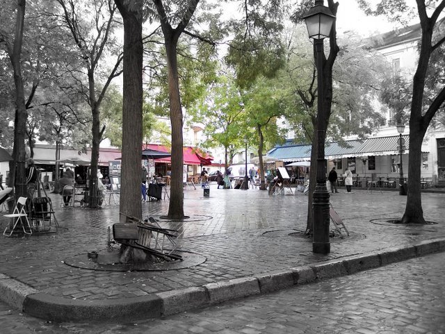 Update [2007-10-20 2:27:40 by LEP]: This photo is of the Place du Tertre, near the top of Montmartre. It is always filled with chairs and tables from the restaurants surrounding it and tourists walking around and artists trying to get a commission to draw your profile. To see it like this, in it's lovely self, you have to go very early in the morning. afew and I lived very close to here at earlier stages in our lives. I have posted my original color photo of the Place du Tertre at the end of the comments below.