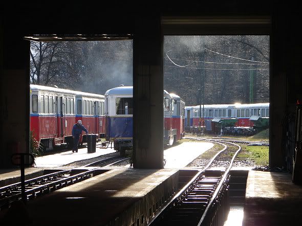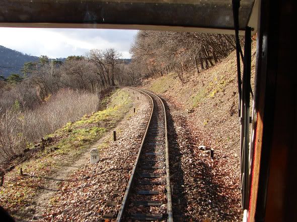 The Children's Railway was built as Pioneers' Railway in the mountains of Buda in the first few years of communist dictatorship. [EDITED->] Poemless in the comments made me realise that while pioneers' railways were well-known from Berlin to Vladivostok, they may lack Western counterparts and sound strange to Westerners, so a bit of explanation. Pioneers' railways were small narrow-gauge forest or park railways, built as a popularity-boosting measure by/for the communist party youth organisations in many cities all across the East Bloc, that gave volunteering children the opportunity to 'play' with a full-scale model railway: all jobs except that of locomotive driver and depot jobs are held by children. Being wildly popular and with no shortage of recruits, most found funding to survive the demise of One-Party rule, and now operate as de-politicised children's railways. (See for example a site on ex-USSR lines.) However, our visit to Budapest's Children's Railway was on Monday, the day without revenue traffic, when none of the stations were manned.
