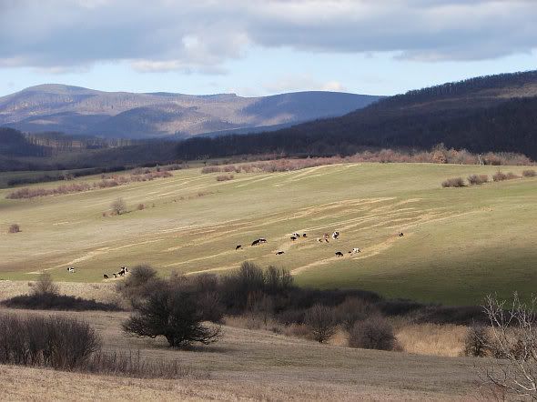 The grass just began to grow again, and the cows already graze on the hillside. On the horizon to the right, the Csóványos (938 m), highest peak of the Börzsöny mountains, part of what was the crater rim of a Vesuve-sized volcano 14 million years ago