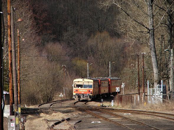 The branch-line station, far from the village in a narrow valley covered by forests, is kept alive & busy by a military fuel depot. Surprisingly, the train arrived on-time by the minute.