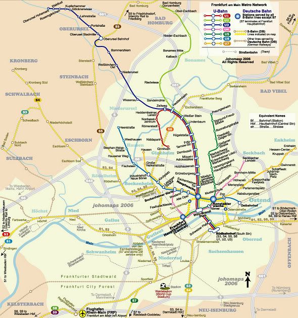 Frankfurt's U-Bahn, a light metro system (apart from the purple line); with the core of the superposed S-Bahn system (thick yellowish-brown) and normal light rail (dashed grey) also drawn in, as are other railways (thin brown) and highways (grey). The metropolitan area is right of center, where stations are frequent: note how three metro lines go way out from the city. Original full-size map at JohoMaps