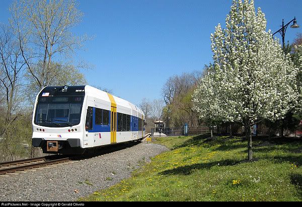 NJT 3510 as northbound train to Trenton enters Bordentown Station with trees in full boom for spring. April 2008 photo by Gerald Oliveto from RailPictures.Net