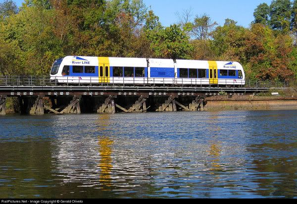 The River LINE is a transit service on a railway line along the Delaware River in New Jersey, run by that US state's public transport company NJ Transit. It operates GTW 2/6s, European-standard low-floor articulated diesel multiple units (DMUs) made by Swiss maker Stadler. Due to the higher US structural stiffness requirements, they are categorised as "light rail".
