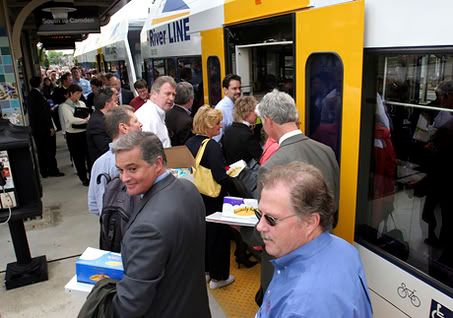 Unique Rail...Restaurants started popping up close to stations and proposals for building conversions and brownfield developments began to take shape. Sure enough, new and existing businesses, such as restaurants and stores reported growing business soon after opening day, leading one local newspaper to very quickly ask, "Could it be that the River LINE will be a success?"