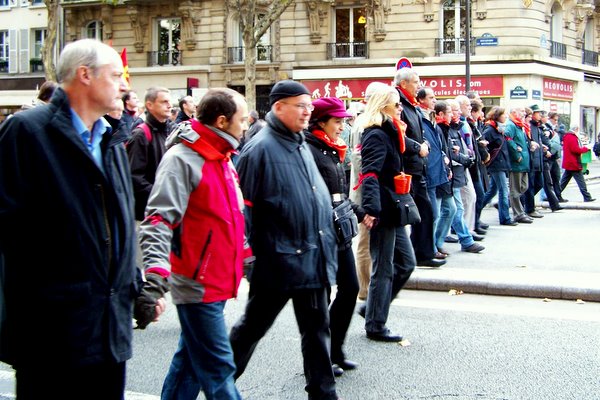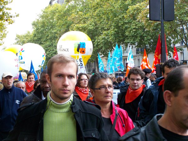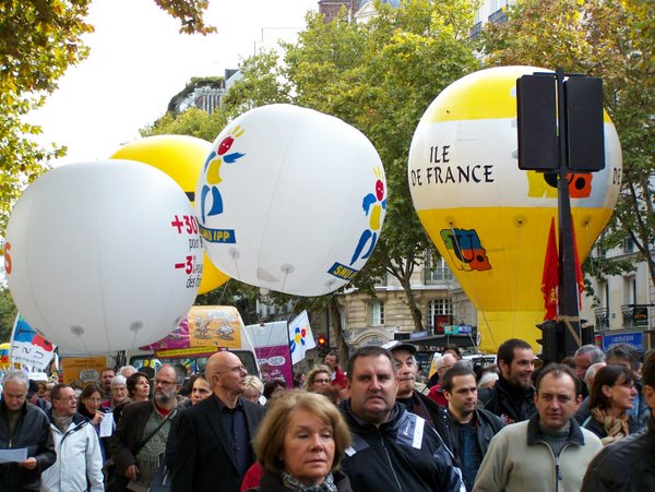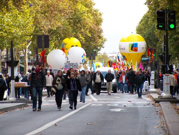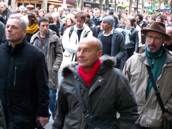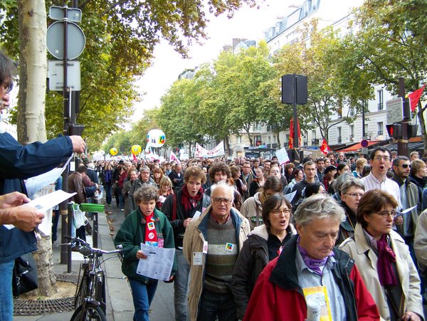 Update [2010-10-20 5:8:4 by LEP]:There were two marches from Place d'Italie to Invilides. I waited for the one that came through Blvd. Montparnesse, right around the Gare Montparnase. Blvd. Montparnesse is a very wide boulevard so the people weren't as pressed together as in the previous marches. The marchers started arriving at the Gare Montparnesse about 2:45 p.m. and kept coming until 7p.m.