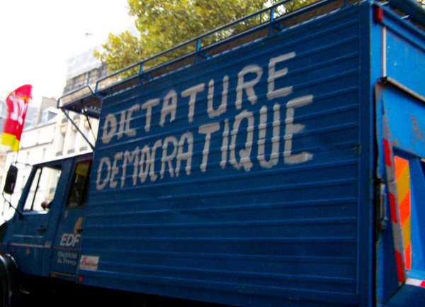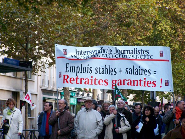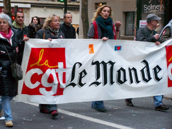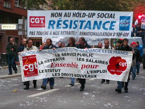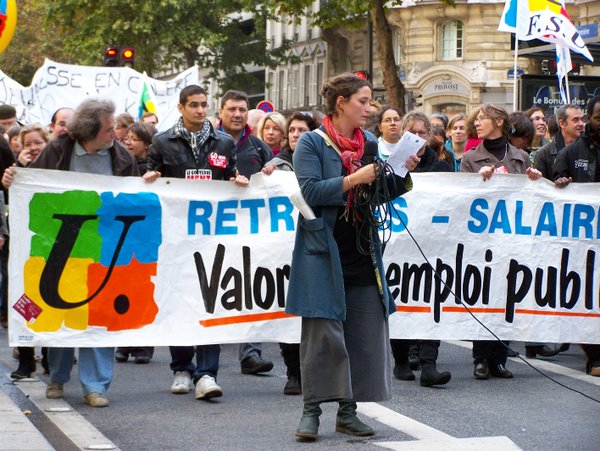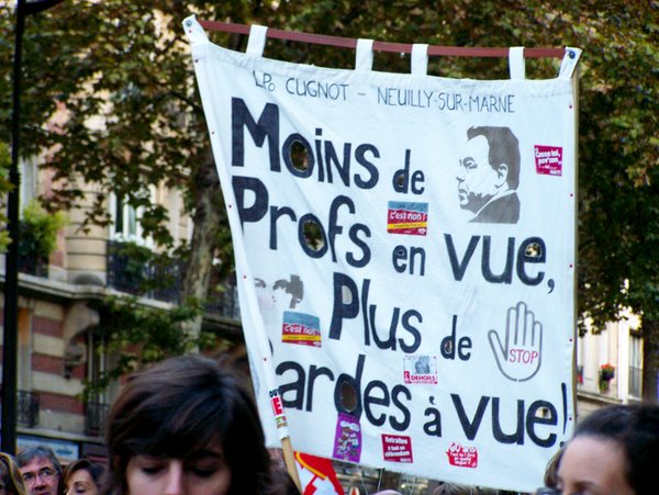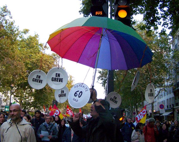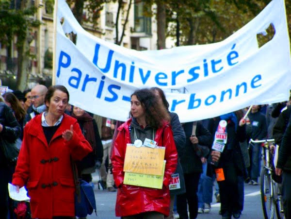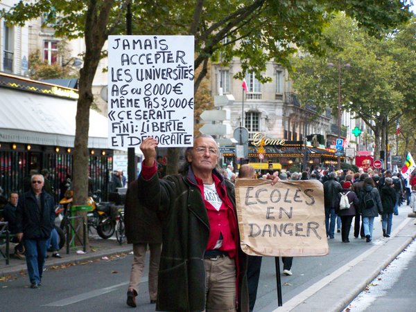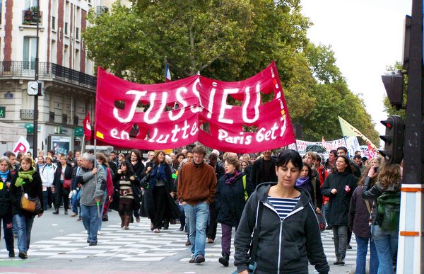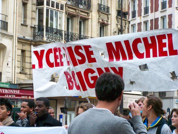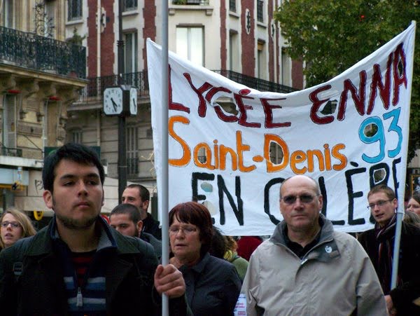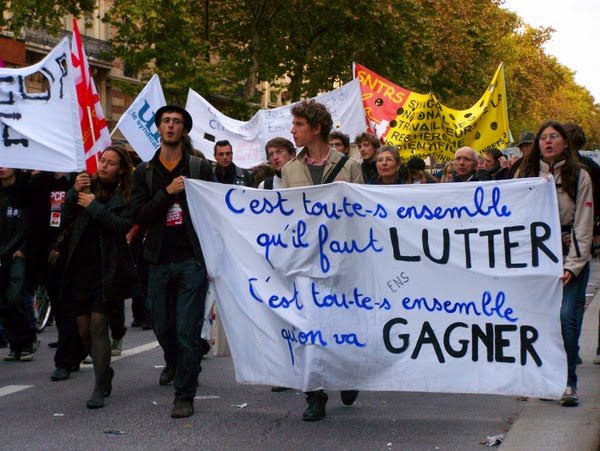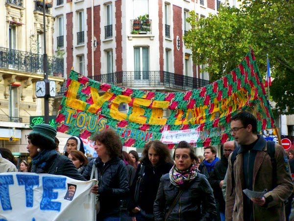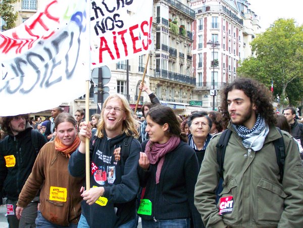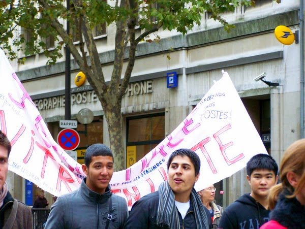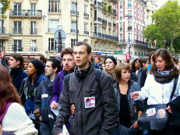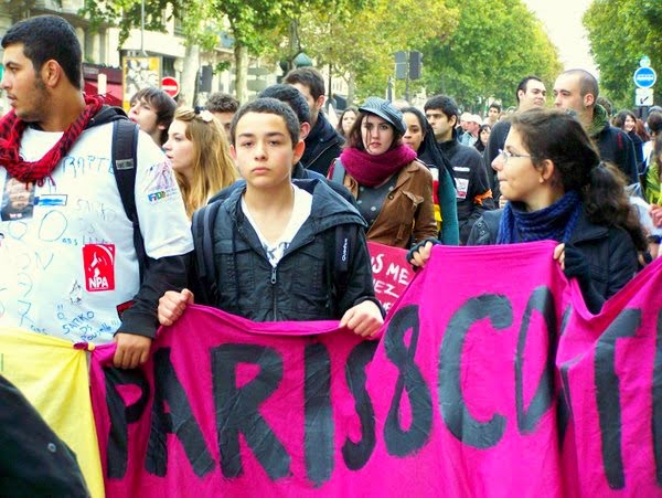 Another very large demonstration in Paris Tuesday, as well in as a couple of hundred other cities in France. In Paris in addition to the usual union marchers thousands of students, high school and university, came out today. Here's the new spirit: