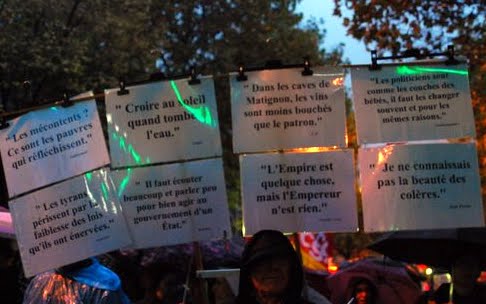 I was home in the country for the weekend but an allergic attack caused an early return to Paris so I stopped at Nation, the terminus of the march, around 5:15. It was almost dark and difficult to take photos,but I managed a few.