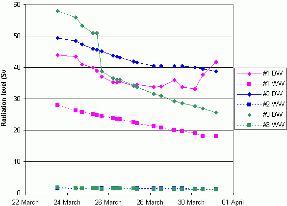 The IAEA is reporting that measured soil concentrations of Cs-137 as far away as Iitate Village, 40 kilometers northwest of Fukushima-Dai-Ichi, correspond to deposition levels of up to 3.7 megabecquerels per square meter (MBq/sq. m). This is far higher than previous IAEA reports of values of Cs-137 deposition, and comparable to the total beta-gamma measurements reported previously by IAEA and mentioned on this blog.