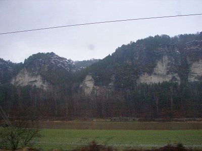 View from the train window across the flooding Elbe river at the sandstone walls near Kurort Rathen this February (sorry for the weather- and dirty window-related bad quality)