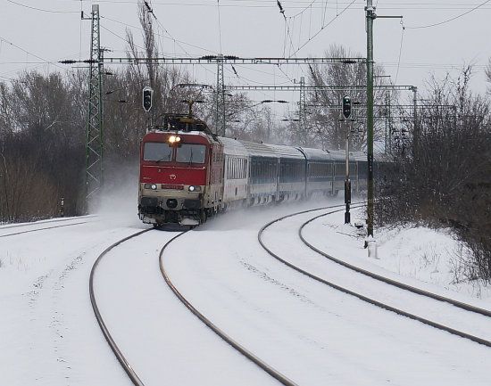 An express train arrives late on a weed-infested track in the station of Krievci on a summer morning in 2011, also adding another 15 minutes to the already one-hour delay of the Venice–Budapest night train on the single-track line