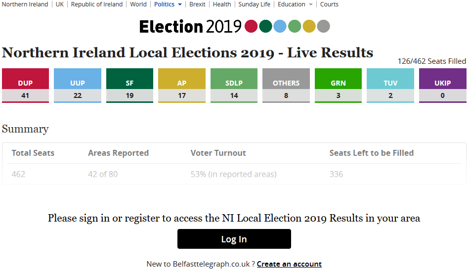 The last N. Ireland Local Elections at the same time as the European Parliament elections which would have boosted the turnout. This time around turnout is also estimated to be quite high, at 50-55%, and the first results are now in. It is too early to discern any trend, however.